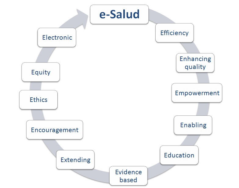 El mismo autor nos hace ver la amplitud del término al apuntar que la «e» de e-salud no se refiere únicamente al aspecto electrónico, sino que lo hace también a otros diez conceptos, las diez «es» (en inglés):