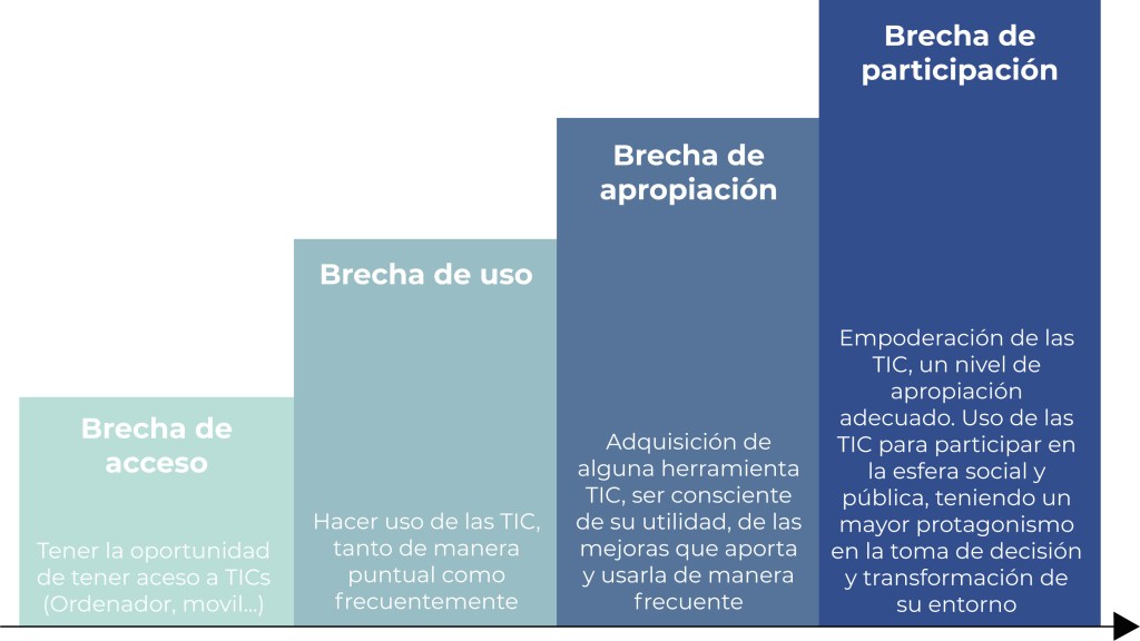Tal como analiza el informe “E-inclusión y participación ciudadana en las esferas social y pública a través de las TIC en Euskadi” del Ararteko, el posicionamiento de las personas en un estadio de empoderamiento digital, supone que hablemos de la existencia de diferentes brechas digitales: la brecha de acceso, la brecha de uso, la brecha de apropiación y la brecha de participación.